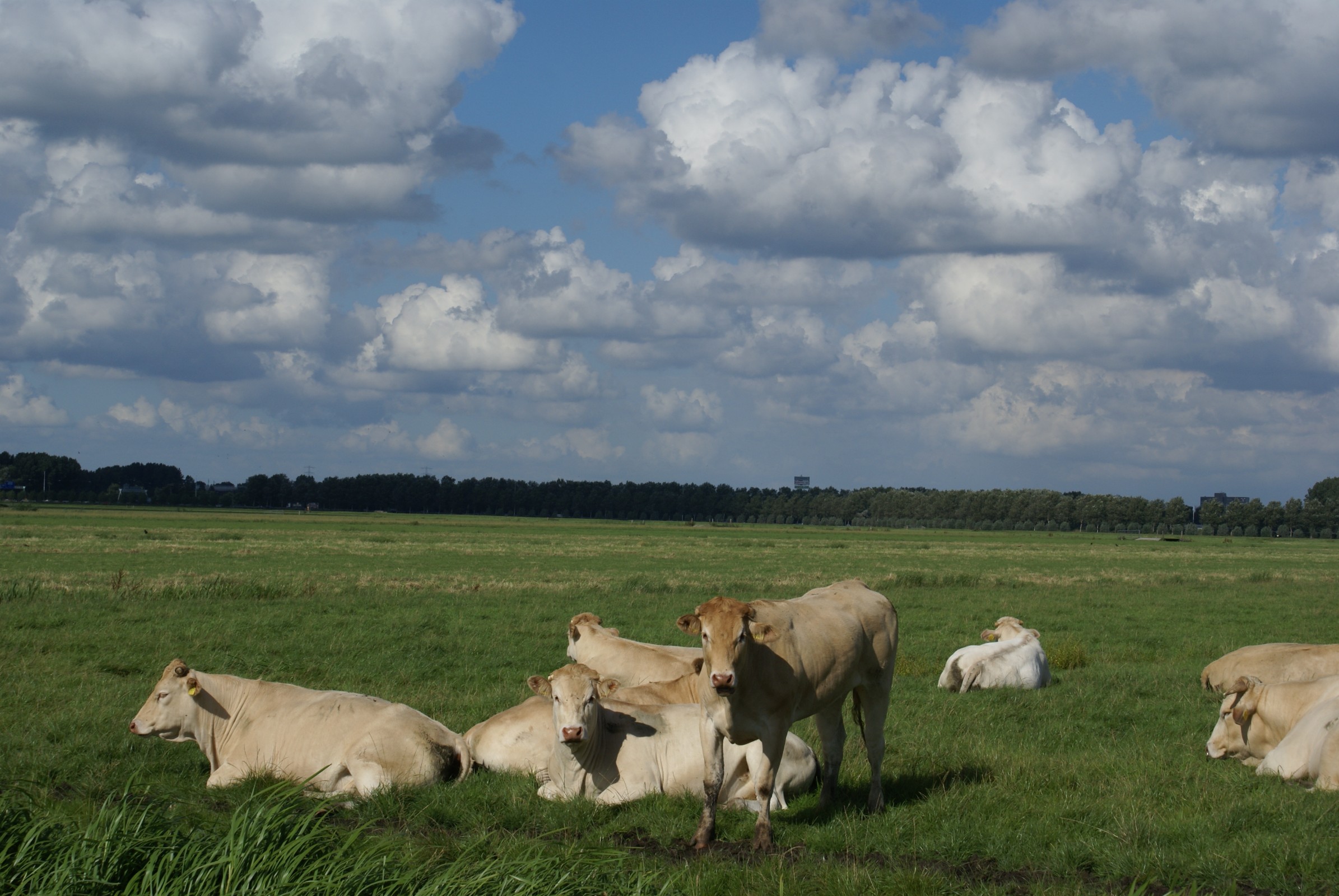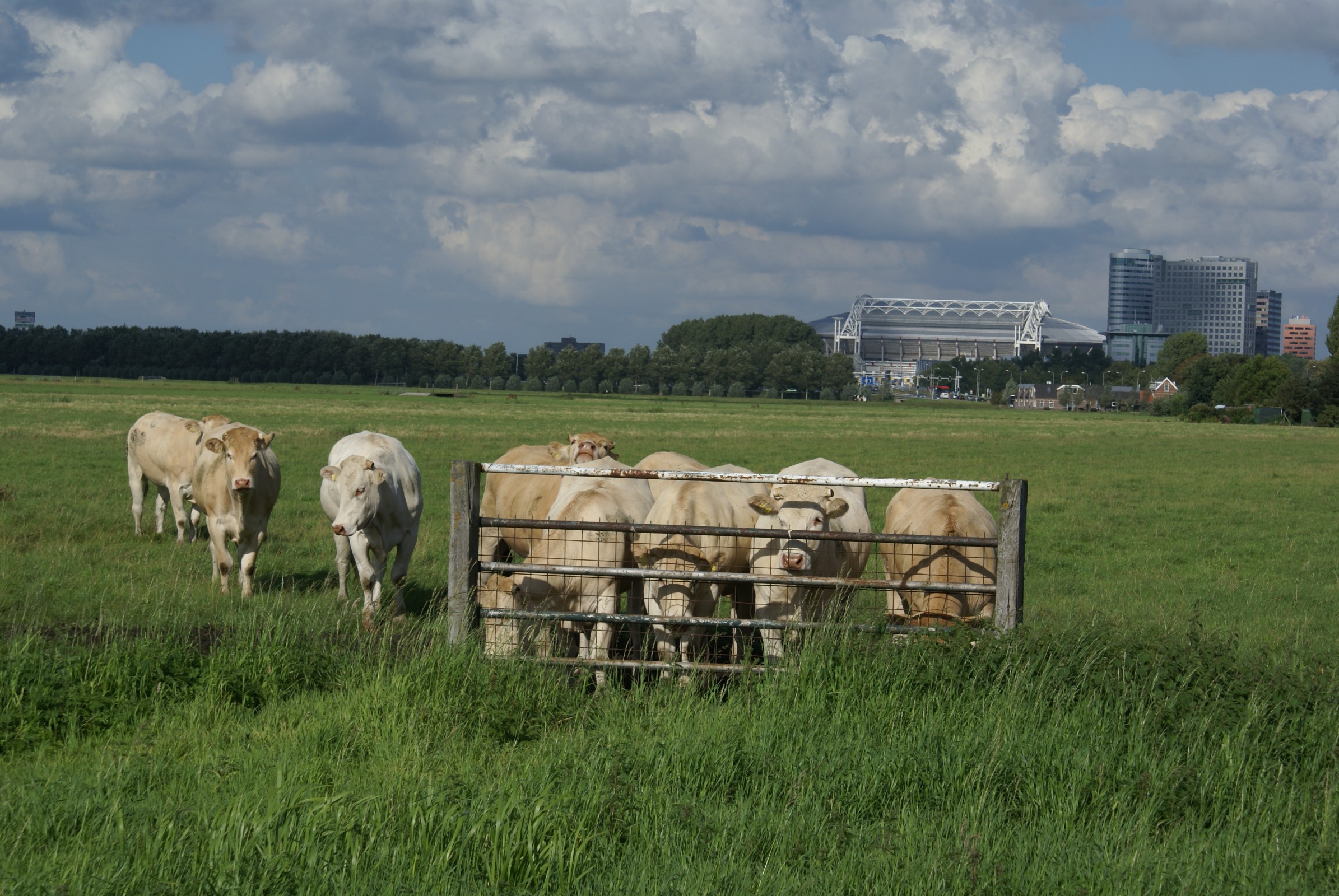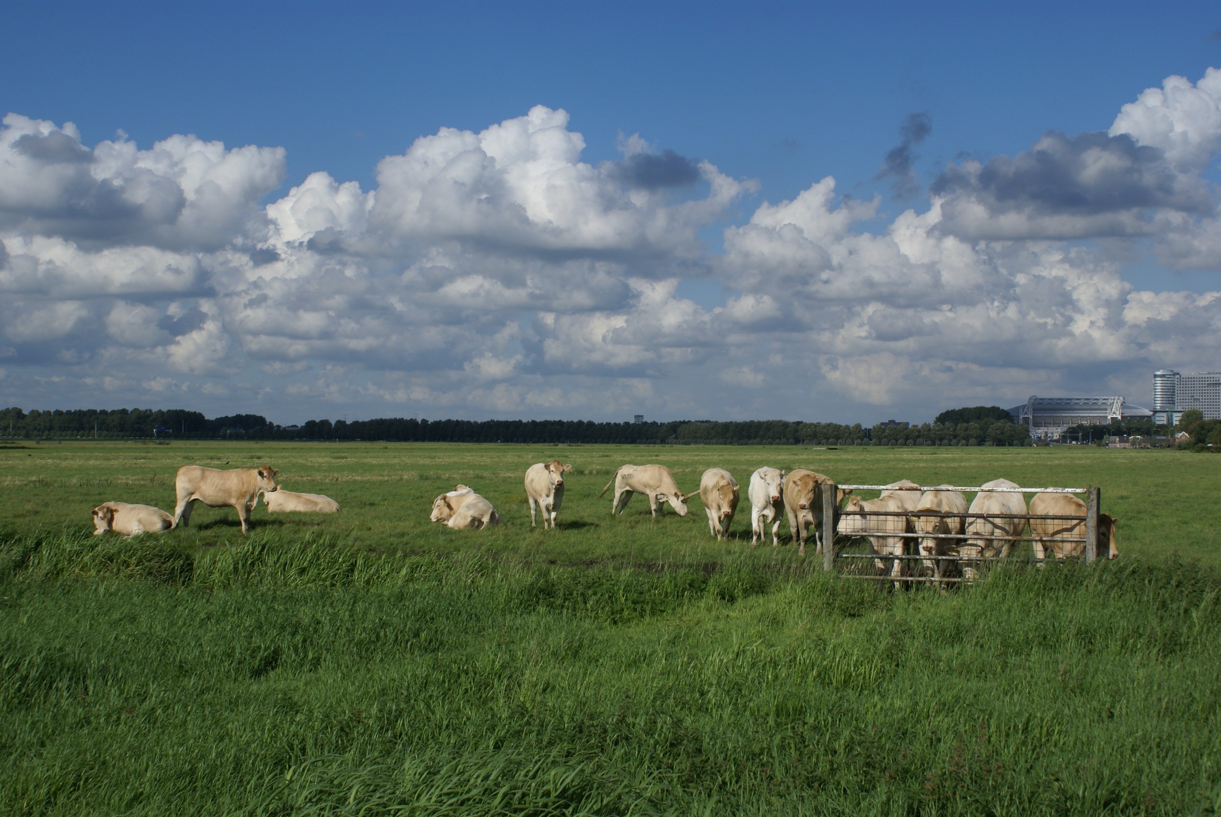 Koeien op het weiland bij Ouderkerk a/d Amstel. Op achtergrond Amsterdam ArenA.